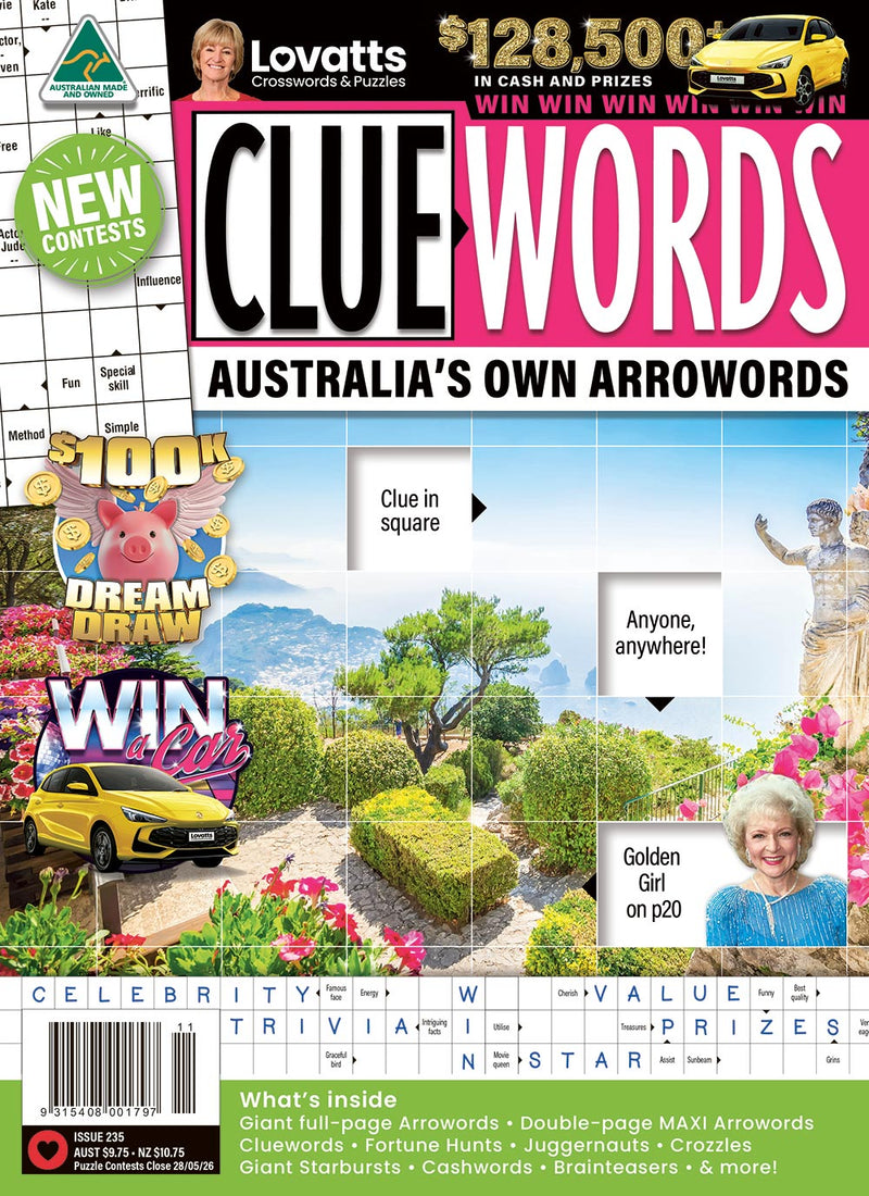 A more relaxed experience than our traditional crosswords, Cluewords magazine features everyday, celebrity, and trivia crosswords in the popular clue-in-square format. Every issue features loads of popular cluewords, along with our magnificent double-page MAXIs, fabulous Fortune Hunts, juicy Juggernauts, captivating Crozzles, sparkling Starbursts, and bemusing brainteasers. With contests to enter and prizes to win, there’s something for everyone.